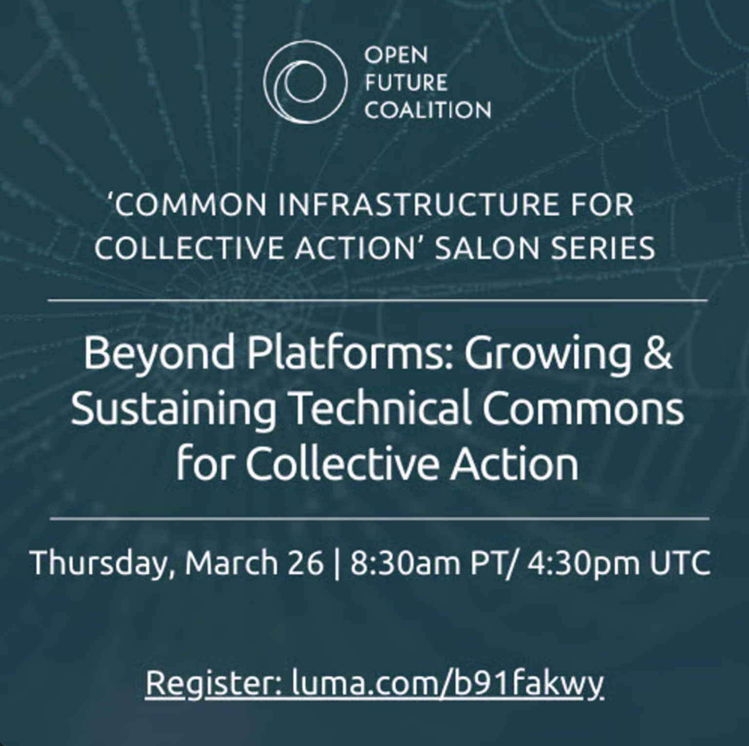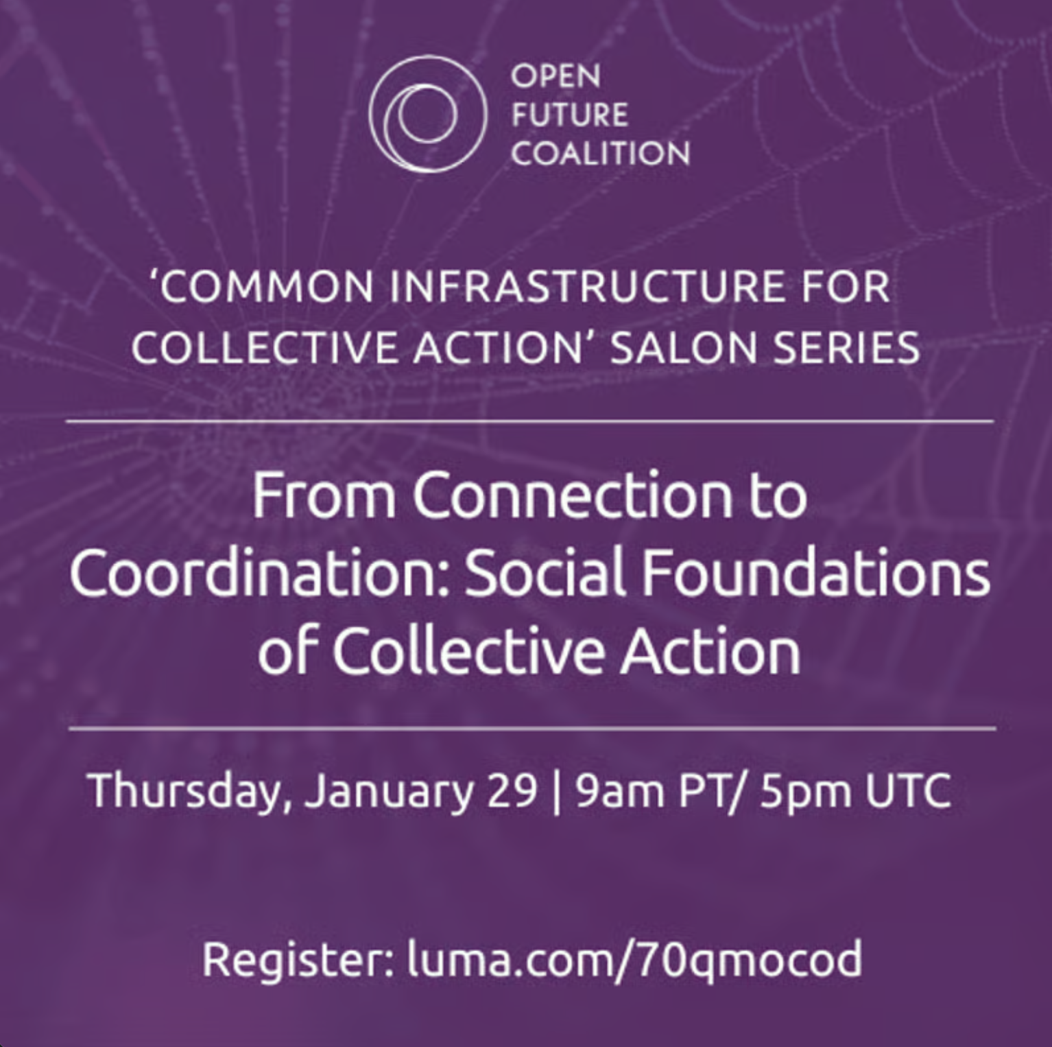 Join Open Future Coalition for our emergent three-part virtual salon series - Common Infrastructure for Collective Action - designed to bring together diverse leaders and organizations shaping the landscape of collective action. These gatherings will showcase promising efforts already underway while creating space for cross-sector dialogue, shared sensemaking, and practical exploration of how common infrastructure can strengthen movements and enable greater cooperation across fields.